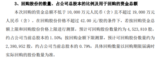 据了解,本次拟回购股份的种类为A股。本次回购的资金总额不低于10,000万元人民币(含)且不超过19,000万元人民币(含)。在回购股份价格不超过42.00元/股的条件下,若按回购资金总额上限和回购股份价格上限进行测算,预计可回购股份数量约为4,523,810股,约占公司当前总股本的1.50%;按回购金额下限测算,预计可回购股份数量约为2,380,952股,约占公司当前总股本的0.79%,具体回购数量以回购期限届满时实际回购的股份数量为准。