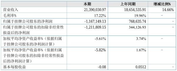 挖贝网8月25日,环诺环保(872205)近日发布2021年半年度报告,报告期内营业收入21,390,030.97元,同比增加14.66%;亏损1,167,149.13元,同比由盈转亏。