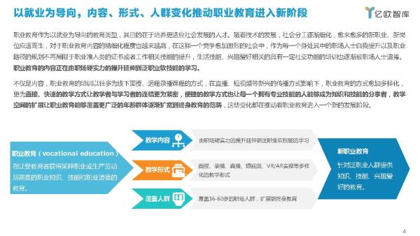 在刚刚过去的2021年里,职业教育相关政策频发,社会分工越来越细化,在行业深入发展的同时催生了很多新职业、新岗位,新职业教育也开始大放异彩。近日,科技与产业创新的研究机构亿欧智库发布了《2021新职业教育行业发展研究报告》(以下简称“报告”),该报告在职业教育体系的基础上,围绕职业教育的适应性、在线化和终身化,呈现了在竞争愈加激烈的社会环境下,职业教育发展的新形态,并展望了未来新职业教育的发展趋势。