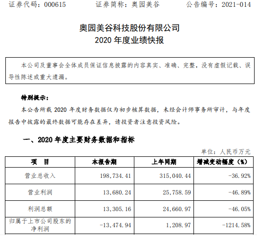 挖贝网3月30日,奥园美谷(000615)发布2020年度业绩快报公告,公告显示,2020年1-12月营业总收入为198,734.41万元,比上年同期下滑36.92%;归属于上市公司股东的净利润为-13,474.94万元,较上年同期由盈转亏。